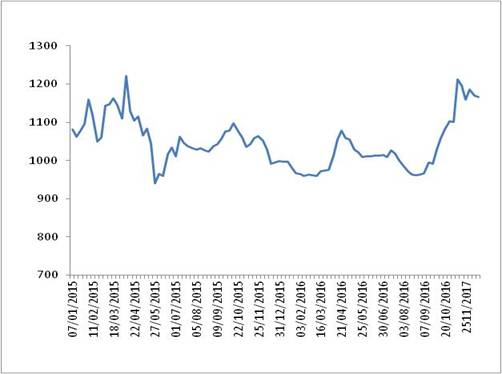 圖 1 2015-2016年各周中國公路物流運(yùn)價指數(shù)