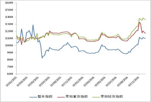 本周,公路物流市場需求總體延續(xù)了前期的平穩(wěn)走勢。但前期因受到治超、“雙十一”等綜合因素影響,價格上漲明顯,波動幅度增大。近期隨著需求回穩(wěn),價格指數(shù)隨之有所回調(diào),但總體仍高于上年同期水平。從后期走勢看,未來公路運(yùn)輸市場需求有望保持平穩(wěn)增長態(tài)勢,運(yùn)價指數(shù)可能將延續(xù)小幅回調(diào)走勢。