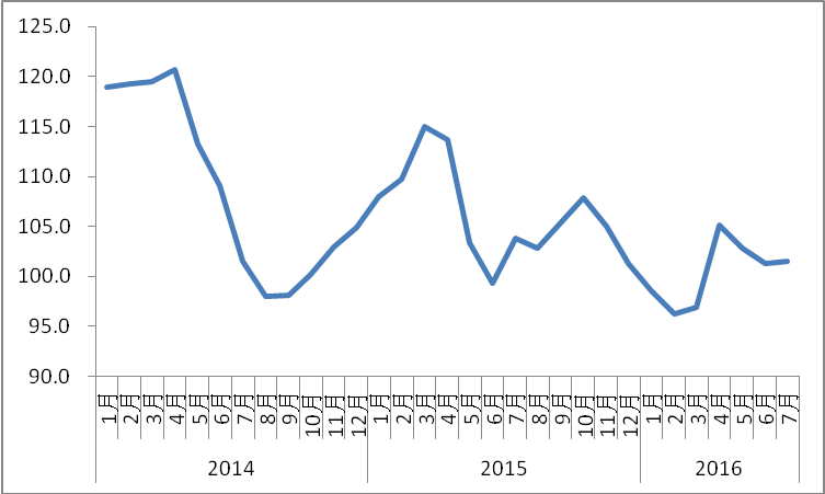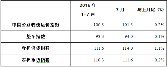 中國公路物流運(yùn)價指數(shù)2016年7月為101.5點(diǎn),比上月小幅回升0.2%,比年初回升3.0%,但比上年同期下降2.2%。月指數(shù)雖總體小幅回升,但從各周情況看,呈現(xiàn)“波動向下”的態(tài)勢,月內(nèi)除第二周外其他三周均有所回落。