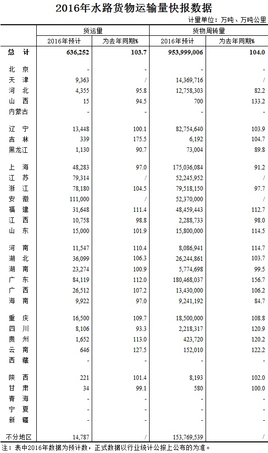 2016年水路貨物運(yùn)輸量快報(bào)數(shù)據(jù)