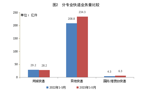 一季度,同城快遞業(yè)務(wù)量累計完成28.2億件,同比下降3.2%;異地快遞業(yè)務(wù)量累計完成234.3億件,同比增長12.2%;國際/港澳臺快遞業(yè)務(wù)量累計完成6.3億件,同比增長46.8%。