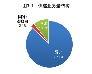 一季度,同城、異地、國際/港澳臺快遞業(yè)務(wù)量分別占全部快遞業(yè)務(wù)量的10.5%、87.1%和2.4%;業(yè)務(wù)收入分別占全部快遞業(yè)務(wù)收入的6.0%、50.8%和10.9%。與去年同期相比,同城快遞業(yè)務(wù)量的比重下降1.5個百分點,異地快遞業(yè)務(wù)量的比重上升0.9個百分點,國際/港澳臺業(yè)務(wù)量的比重上升0.6個百分點。