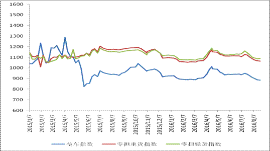 各車型指數(shù)漲跌不一,其中整車指數(shù)、零擔(dān)重貨指數(shù)環(huán)比回落,零擔(dān)輕貨指數(shù)環(huán)比回升。本周,整車指數(shù)為885.5點,環(huán)比回落0.3%,比上年同期下降4.9%;零擔(dān)重貨指數(shù)為1064.7點,環(huán)比回落0.2%,比上年同期下降9.1%;零擔(dān)輕貨指數(shù)為1090.6點,環(huán)比回升0.4%,但比上年同期下降5.1%。