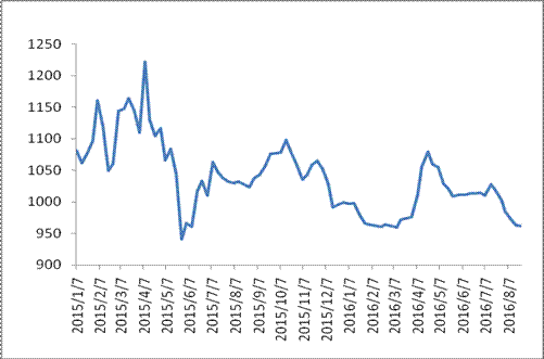 圖 1 2015-2016年各周中國公路物流運價指數(shù)