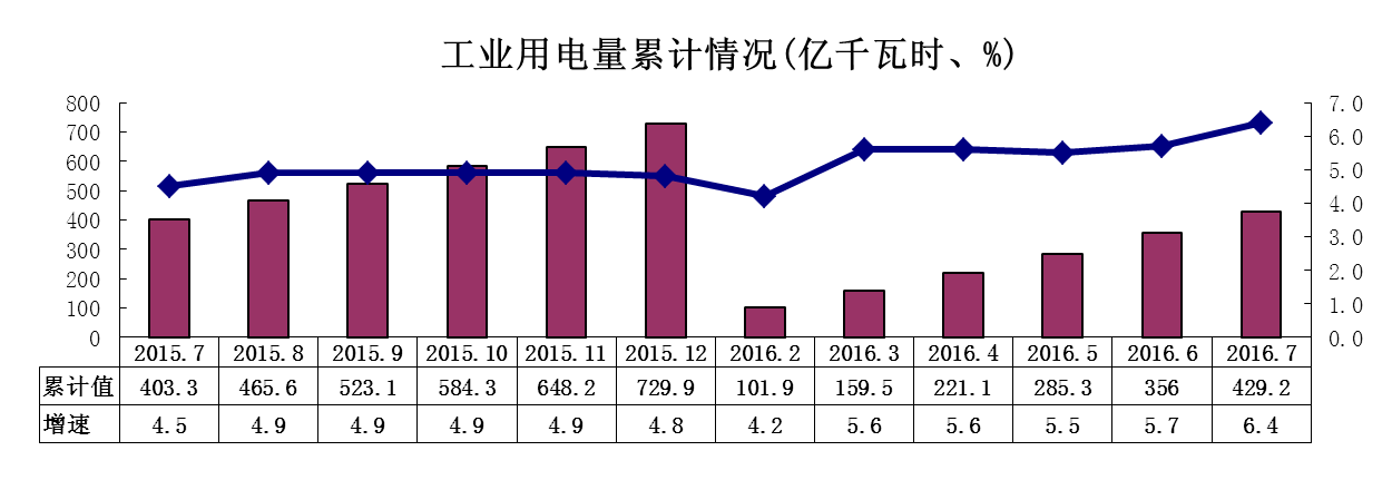 (一)工業(yè)用電量增速連續(xù)小幅提高。我省工業(yè)用電量走勢(shì)繼續(xù)好于全國(guó)。1-7月,全省工業(yè)用電量429.2億千瓦時(shí),增長(zhǎng)6.4%,增速比上半年加快0.7個(gè)百分點(diǎn),高出全國(guó)平均水平4.8個(gè)百分點(diǎn),居全國(guó)第5位、中部第2位。從走勢(shì)來(lái)看,工業(yè)用電增速連續(xù)2個(gè)月小幅加快,反映當(dāng)前工業(yè)經(jīng)濟(jì)運(yùn)行穩(wěn)中向好,但下行壓力依然不可忽視。