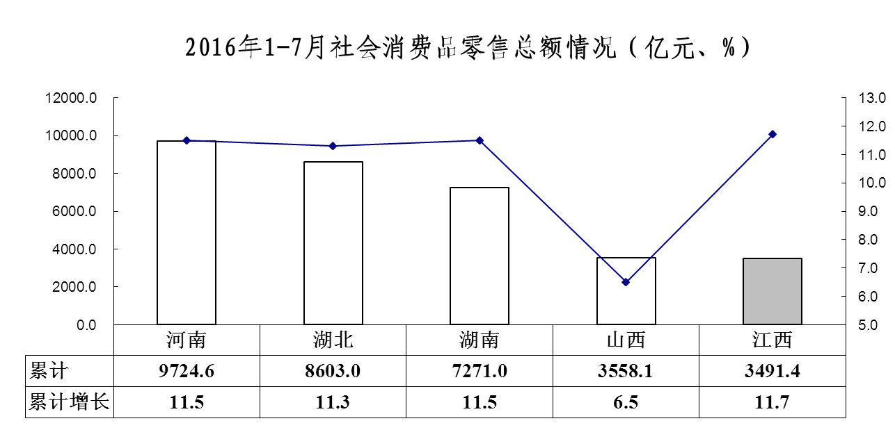 1-7月,中部六省社會(huì)消費(fèi)品零售總額增速平穩(wěn)增長(zhǎng),除安徽數(shù)據(jù)暫未公布外,湖南、山西增速小幅提升0.1個(gè)、0.1個(gè)百分點(diǎn),河南增速持平外,湖北、江西增速較上半年小幅回落0.1個(gè)、0.2個(gè)百分點(diǎn)。1-7月,我省社會(huì)消費(fèi)品零售總額完成3491.4億元,增長(zhǎng)11.7%,增速居中部已知數(shù)據(jù)五省中第1位,總量居末位。各省按增速排名依次為:江西11.7%、河南11.5%、湖南11.5%、湖北11.3%、山西6.5%。
