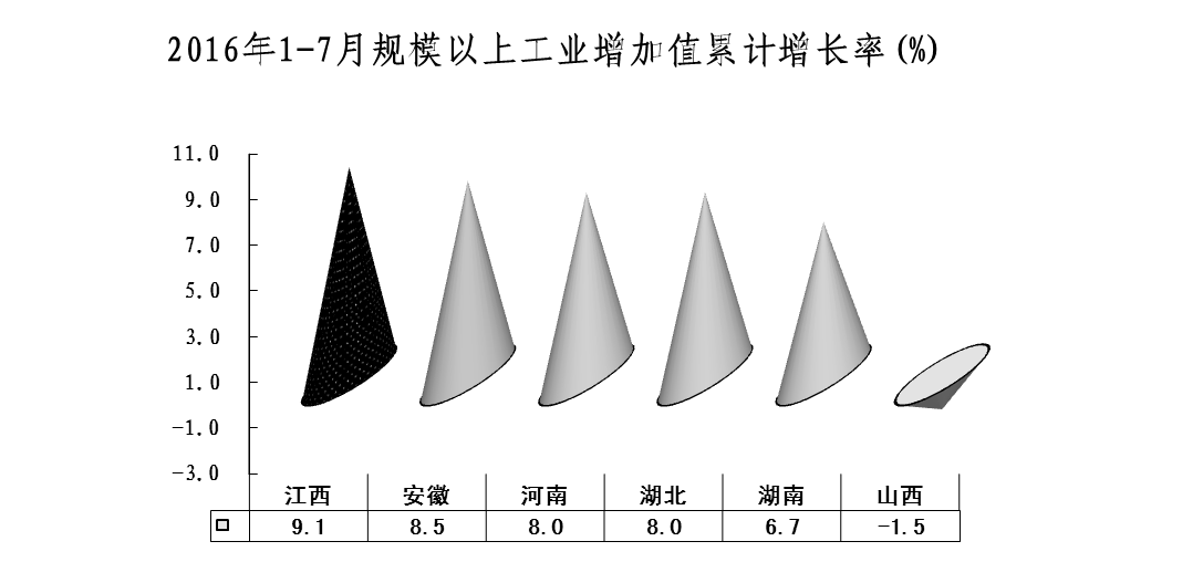 1-7月,江西實(shí)現(xiàn)規(guī)模以上工業(yè)增加值3897.7億元,增長(zhǎng)9.1%,增速較上半年加快0.1個(gè)百分點(diǎn)繼續(xù)居中部第1位。各省按增速排名依次為:江西9.1%、安徽8.5%、河南8.0%、湖北8.0%、湖南6.7%、山西-1.5%。