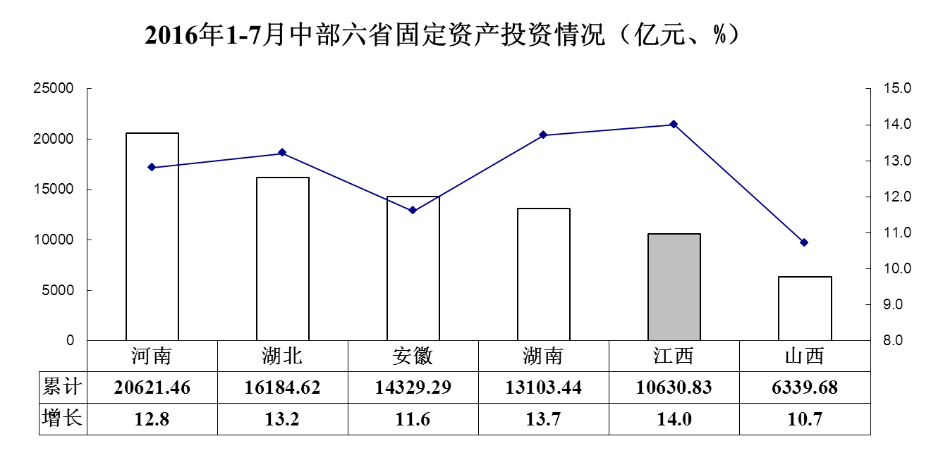 1-7月,中部總體投資增速總體穩(wěn)定,河南、安徽、山西增速較上半年加快0.2個(gè)、0.1個(gè)、0.1個(gè)百分點(diǎn),湖南、湖北、江西增速較上半年小幅回落0.4個(gè)、0.1個(gè)、0.1個(gè)百分點(diǎn)。江西完成投資10630.83億元,增長(zhǎng)14.0%,增速較上半年小幅回落0.1個(gè)百分點(diǎn),增速仍居中部第1位,總量繼續(xù)居第5位。各省按增速排名依次為:江西14.0%、湖南13.7%、湖北13.2%、河南12.8%、安徽11.6%、山西10.7%。