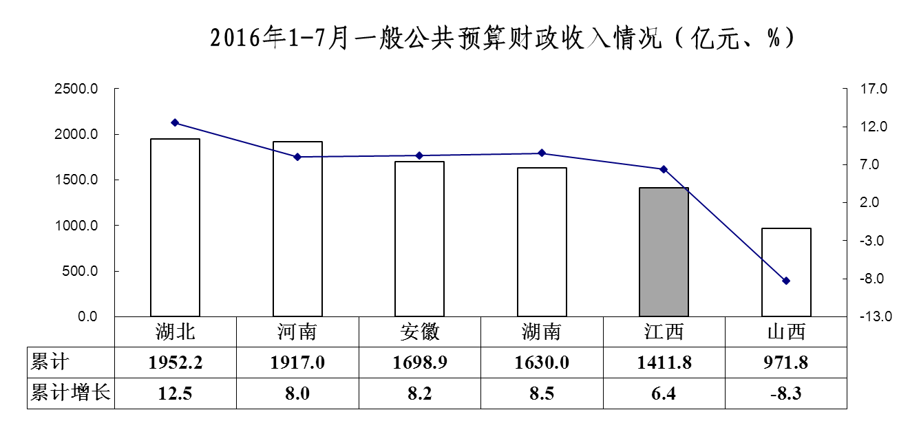 中部財(cái)政收入增速回落。1-7月,各省公共預(yù)算財(cái)政收入增速均較1-5月回落,幅度在0.5-4.5個(gè)百分點(diǎn)之間,山西繼續(xù)負(fù)增長(zhǎng),且降幅較上半年擴(kuò)大0.9個(gè)百分點(diǎn)。1-7月,我省實(shí)現(xiàn)公共預(yù)算財(cái)政收入1411.8億元,增長(zhǎng)6.4%,較上半年回落2.1個(gè)百分點(diǎn),增速繼續(xù)居中部第5位,總量繼續(xù)居第5位。各省按增速排名依次為:湖北12.5%、湖南8.5%、安徽8.2%、河南8.0%、江西6.4%、山西-8.3%。