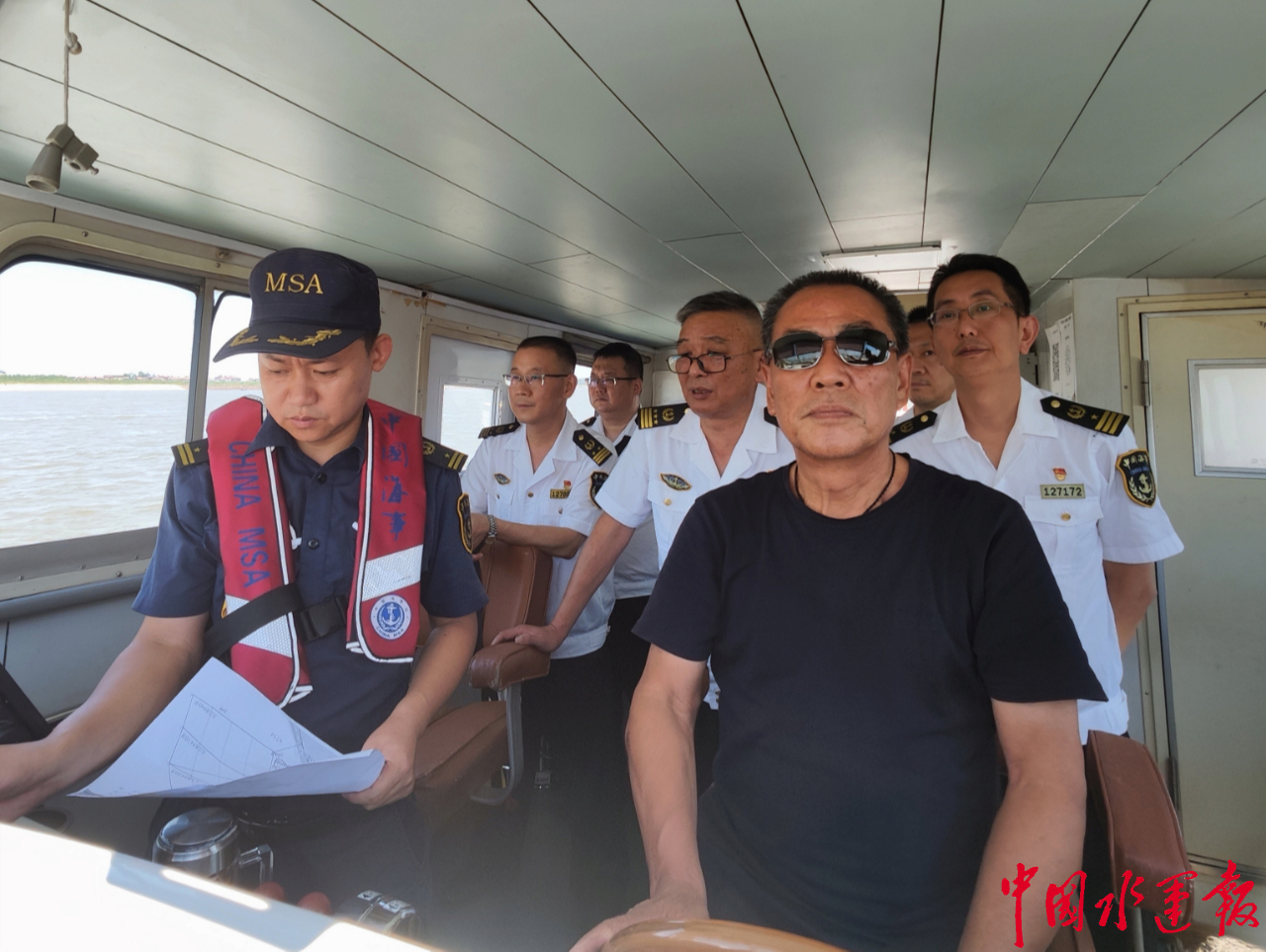 為確保九江水道疏浚工程順利進行,8月8日中午,九江海事局王良勇副局長、顧啟忠副局長攜局指揮中心、通航處到九江水道南槽水域,在武穴海事處丁振海處長、張宏副處長的陪同下坐鎮(zhèn)現場指導航道疏?!敖夷粦?zhàn)”。