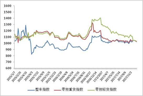 本周(2017年12月25日~12月29日),由中國物流與采購聯(lián)合會(huì)和林安物流集團(tuán)聯(lián)合調(diào)查的中國公路物流運(yùn)價(jià)指數(shù)1012.35點(diǎn),環(huán)比回落1.63%。