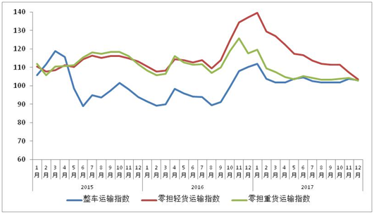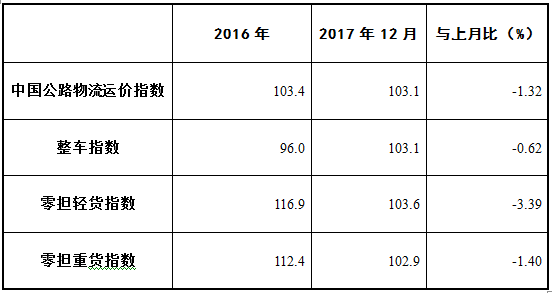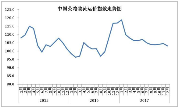 由中國(guó)物流與采購(gòu)聯(lián)合會(huì)和林安物流集團(tuán)聯(lián)合調(diào)查的中國(guó)公路物流運(yùn)價(jià)指數(shù)2017年12月為103.1點(diǎn),比上月回落1.32%,在連續(xù)兩個(gè)月回升后小幅回落。
