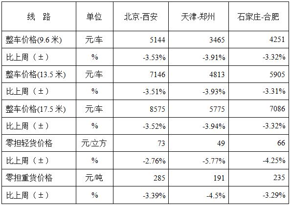 各車型指數(shù)均有不同程度回落,其中整車指數(shù)回落幅度高于零擔(dān)指數(shù),在零擔(dān)指數(shù)中零擔(dān)重貨指數(shù)回落幅度高于零擔(dān)輕貨指數(shù)。其中,整車指數(shù)為1012.25點,比上周回落3.54%;零擔(dān)輕貨指數(shù)為1025.87點,環(huán)比回落3.39%;零擔(dān)重貨指數(shù)為1010.69點,環(huán)比回落3.49%。