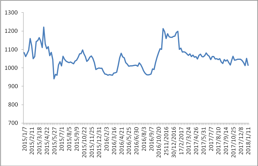 圖 1 2015-2018年各周中國公路物流運(yùn)價指數(shù)