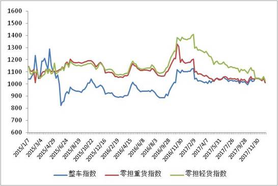 本周(2018年1月8日~1月12日),由中國物流與采購聯(lián)合會和林安物流集團(tuán)聯(lián)合調(diào)查的中國公路物流運(yùn)價指數(shù)1014.5點,環(huán)比回落3.5%。