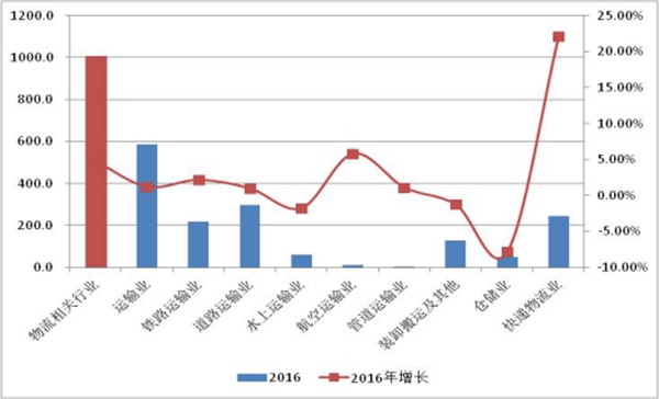 2016年末物流相關行業(yè)從業(yè)人員及增長情況(單位:萬人,%)