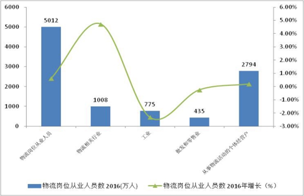從分行業(yè)情況看,我國物流專業(yè)人才保持較快增長。2016年末,我國物流相關行業(yè)從業(yè)人員數(shù)為1008萬人,比上年增長4.7%,增速高于城鎮(zhèn)就業(yè)人員1.5個百分點;從事物流活動的個體工商戶從業(yè)人員為2794萬人,比上年增長0.2%;工業(yè)、批發(fā)和零售業(yè)等行業(yè)法人單位的物流崗位從業(yè)人員為1211萬人,比上年下降1.6%。